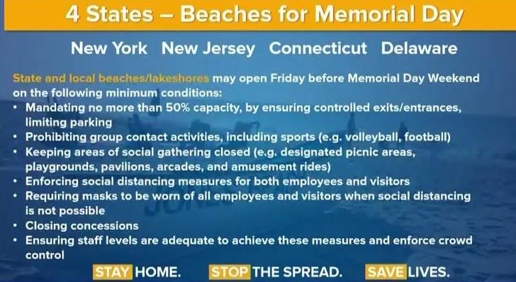 NYS will open all beaches for Memorial Day weekend. The rules are no more than 50% capacity and no concession stands. Masks are mandatory but bathing suits are fine. Must practice social distancing, no arcades, no picnic and no group activities including contacts.