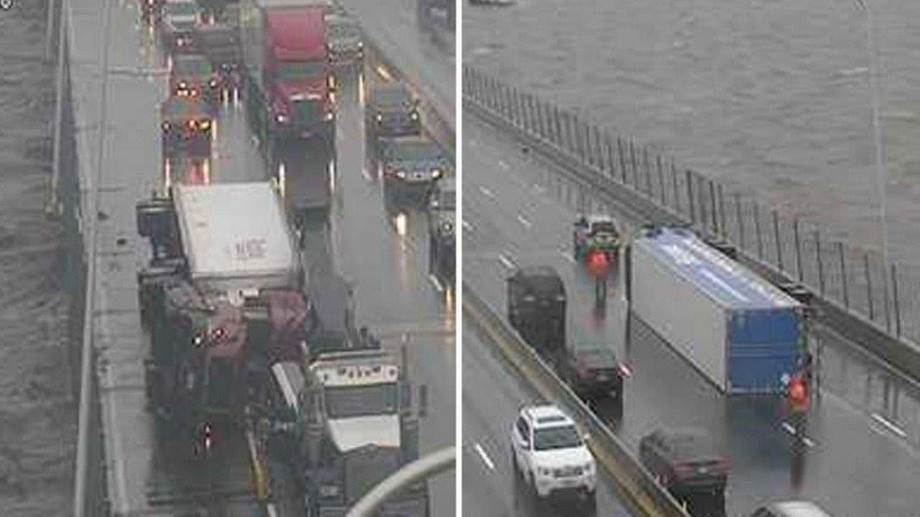 The former Tappan Zee Bridge now called Cuomo Bridge is closed in both directions due to wind knocking out truck. Transportation officials are enroute. pic courtesy of NYSDOT.