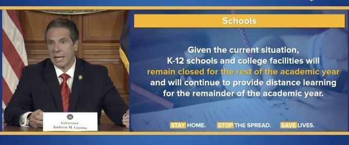 Governor Cuomo stated all schools and colleges in NY including NYC will remain closed. For the summer, an announcement will be made at a later date. Until June, distance learning remains. The mayor has not responded to this after announcing on April 11 all NYC schools will remain closed for the academic year.