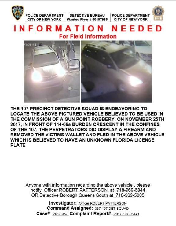 Police disclosed information to the public on January 2 of armed robbery that occurred in Briarwood near Main Street and Van Wyck Expressway. A victim was robbed of wallet on November 25 and the suspec took off in a vehicle with Florida licence plates. Ongoing investigation.