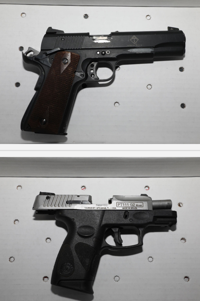 According to Detectives, a disturbance involving a physical altercation did occur on the side of the building of 30 Old Mill Court between multiple individuals known to each other. During the physical altercation defendant Kevin Cooper, 56, did accidentally discharge a loaded 9-millimeter Taurus handgun which he was carrying inside his hooded sweatshirt pocket, causing injuries to his abdomen and surrounding areas. The discharge caused the participants in the altercation to disperse. Defendant Kevin S. Cooper Jr., 34, did point a handgun at 50-year-old female victim, placing her in fear for her life, he then struck the female victim with the firearm causing injuries requiring her to be hospitalized. Following this, Cooper Jr., and his brother, defendant, Devin Cooper, 27, did run after a male victim who was fleeing. Cooper Jr. pointed a loaded American Tactical, .22 caliber, defaced, handgun at the fleeing victim. He then handed the firearm to defendant Devin Cooper who fired two rounds in the direction of the victim. Both firearms were recovered. All three defendants reside at 29 Old Mill Road.