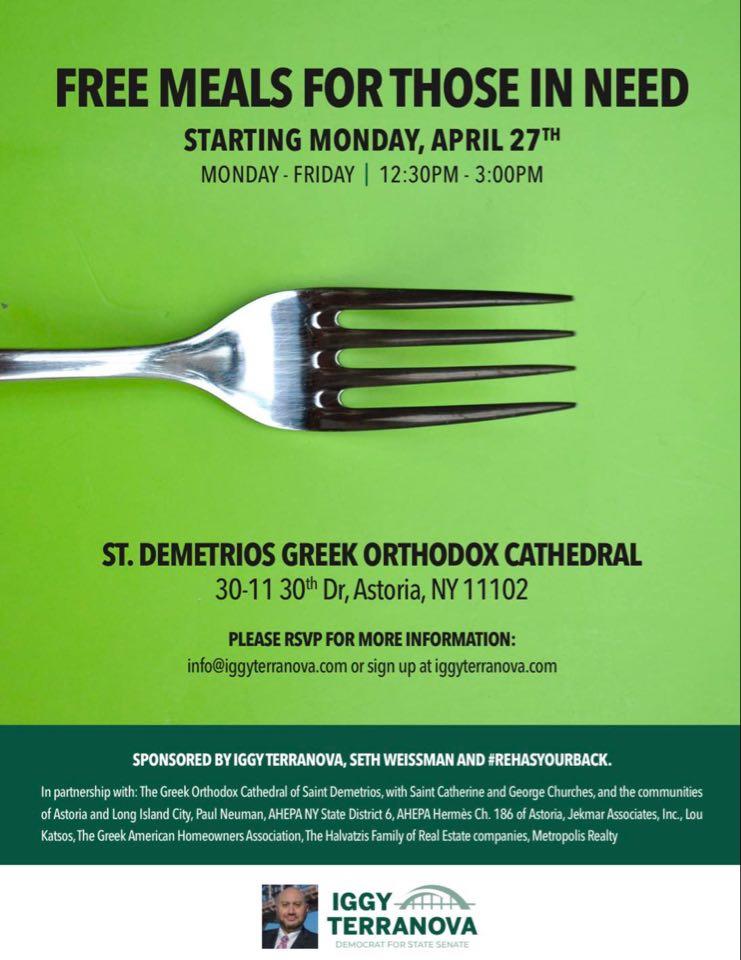 Starting Monday, April 27, Astoria residents can receive free meals. This is organized by Iggy Terranova. a candidate for NYS Senate. Iggy successfully launched the same food distribution program in Long Island City. Meanwhile his competition, Mike Gianaris donated to Urban Upbound NYto deliver in public housing. The food is open to the public.