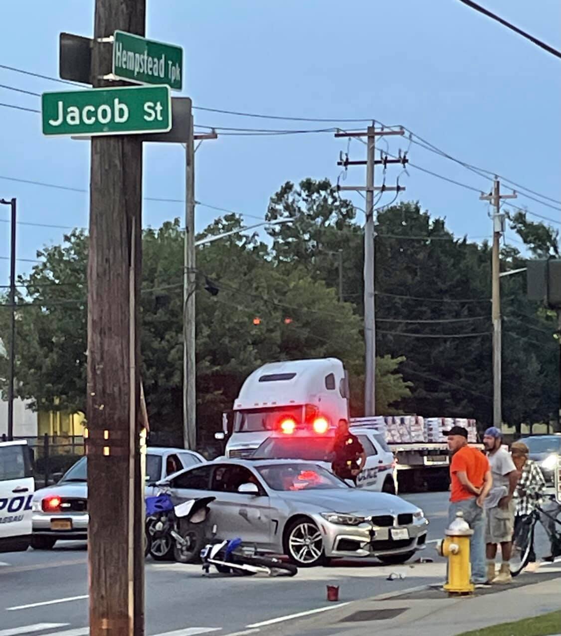 Police closed off Hempstead Turnpike in Elmont reporting a BMW was involved in a crash with 2 dirt bikes. EMS is on the scene. Delays all around. The dirt bike’s riders are being treated in the scene by EMS. Ongoing investigation.
