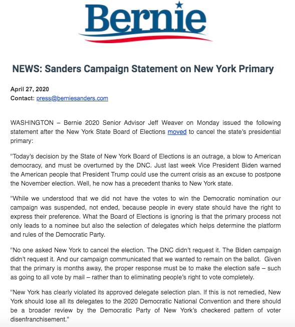 After canceling June 23 presidential, Bernie Sanders's campaign issued a press statement stating NY should lose all its delegates to the Democratic convention.