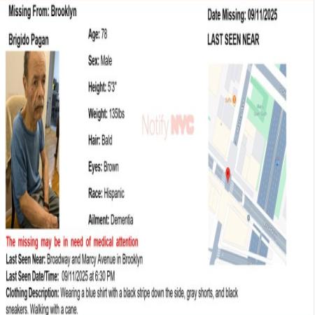 Brigido Pagan, M/H/78 from the area of Broadway and Marcy Avenue in Brooklyn.