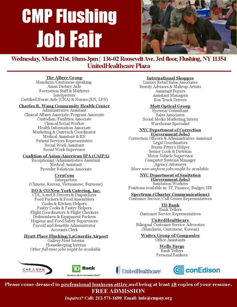March 21 from 10am to 3pm at United Health Care Plaza in 136-02 Roosevelt Avenue, Flushing. Its on the 3rd floor. NYD Dept of Corrections, DSNY, TD Bank, Wells Fargo, Hyatt, LGA and more companies will be participating. Open to the public.