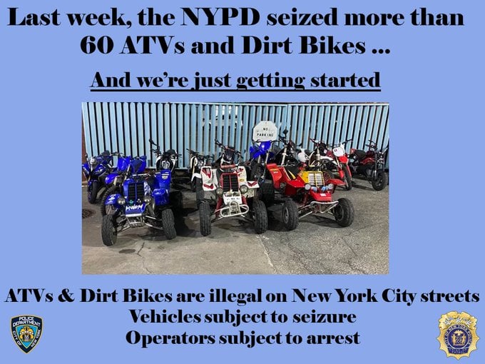 There has been a high rise of complaints of dirt bikes and ATVs on Union Turnpike, Hillside Avenue to Main Street vicinity by residents. According to the NYPD, they are illegal and can be confisticated if seen in action as per law. Now comes the best part. If residents call 911 to complain of such activities, police will have to wait for action to respond which means this is an ongoing investigation. According to several law enforcement, read this well, the chance to confiscate will not happen in action or enforce it due to video taping by the riders and result outcry from the community including local politicians. So what the police will do is drive around and check for dirt bikes and ATVs based on the complaints. Then confiscate with a warrant where it's parked. The bike owner will call to report missing and will get the update where it is. A summon will be issued with a court appearance.