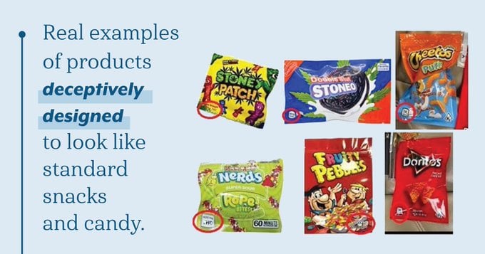 The NY Attorney General reported there are items being sold in NY that look like snacks and candy but they actually contain Tetrahydrocannabinol (THC). There has been accidental overdoses in children nationwide. Check the label for THC marks on the labels and discard them immediately. You can also report to the AG's office, 1-800-771-7755.