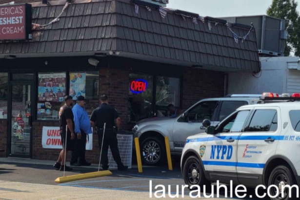Police are at Hillside Avenue and 266 Street reporting a car hit the Carvel building. This is from the side of the building while parked and then went forward after starting the vehicle. EMS is evaluating.