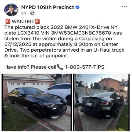 The NYPD is in Clintonville Street reporting a carjacking incident. Police say two suspects, males, blacks followed a BMW and stopped the driver by 12th Road. Then one of the suspect displayed a weapon and pushed out the victim and passenger from the vehicle. The suspect took off with the vehicle toward the Cross Island Parkway northbound.