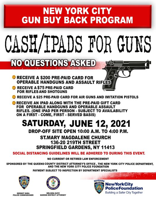 Cash for guns is at Springfield Gardens. No questions asked. Saturday June 12, 2021 at St. Mary Magdalene Church, 136-20 219 Street, Springfield Gardens, NY 11413 from 10:00 A.M. to 4:00 P.M. $200 Pre-paid cards for Handguns and Assault Rifles. $75 Pre-paid cards for Rifles & Shotguns.