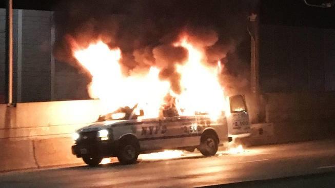 On Saturday, November 11 around 6:45pm, FDNY were called to LIE westbound at Woodhaven Blvd reporting NYPD van on fire. EMS confirmed no member of NYPD were injured. Firefighters placed the fire under control. The cause of fire is under investigation. pic courtesy of lbank.