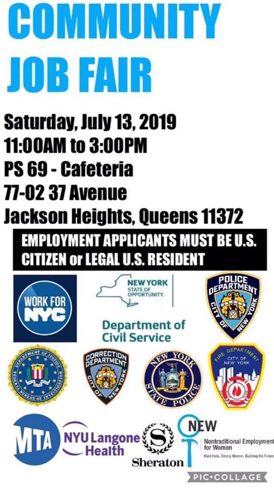 Saturday, July 13 from 11am to 3pm at PS 69 cafeteria in 77-02 37th Avenue in Jackson Heights. Must be US citizen or legal resident. Open to the public.