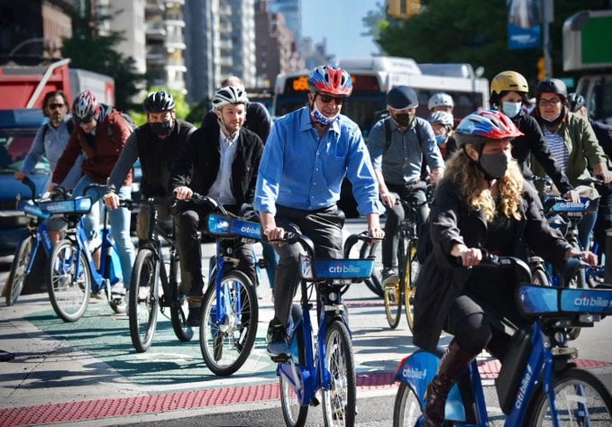 Starting today, the NYC mayor will bike to work instead of his chauffered car with a driver except armed bodyguards on regular basis. He rode the CitiBike from Gracie Mansion to City Hall as a start. A brief stop at Chrystie Street in downtown Manhattan for a press statement with no questions from the media but listen to him only. Although he may be sweating and smelling after the ride, the mayor didn't respond whether he changed his clothes or took a shower before meeting people to start his work. Next destination is Brooklyn for his bike ride. He will announce more dates for all to use bikes instead of cars in the five boroughs by following him. He wants all to use bikes, nothing but bikes to get around the city.