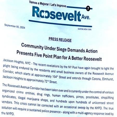 Today, there was a press meet held by the organization, Community Under Siege Demands Action on Roosevelt Avenue to combat organized crime entities, drug rings, human traffickers, prostitution, shoplifting syndicate, unlicensed street vendors, etc. Roosevelt Avenue from 102nd Street to 72nd Street is plagued with crimes where residents and businesses are demanding the city to clean up. The press meet was held on Elmhurst Avenue and Roosevelt Avenue where residents have called local elected officials having their children going to school facing mostly prostitution and drugs.