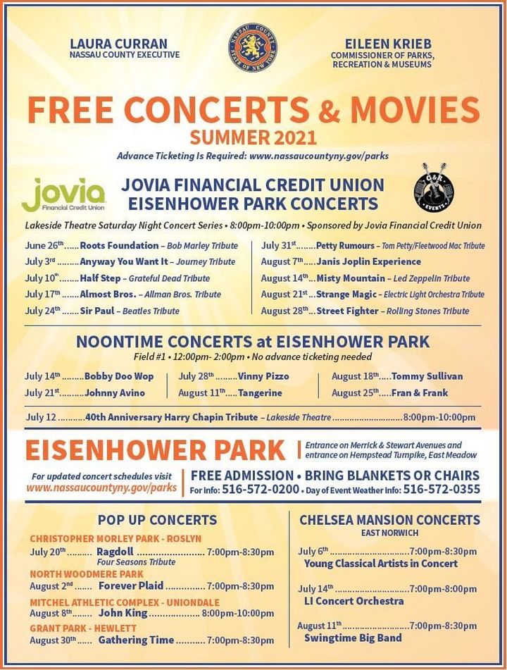 Here is the list of dates and events for Nassau County. The admissions are free. Bring blankets and chairs. All events are open to the public. Arrive early for better seats.