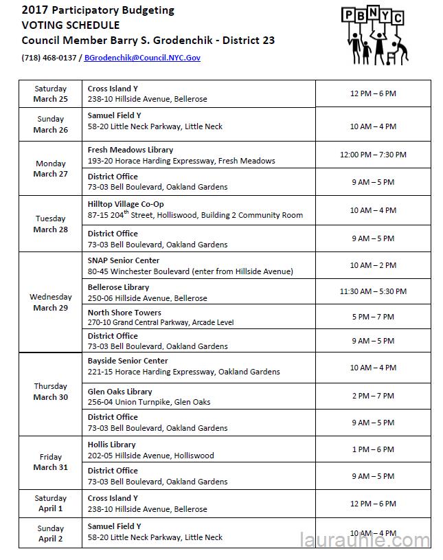 Participatory Budget 2017 dates has been released by NYC Council Member Barry Grodenchik for District 23 covering northeast Queens. One person can vote for five projects. Those unable due to medical or other reasons can call Jaime Cho at (718) 468-0137 or email for absentee ballot, participatorybudgeting.d23@gmail.com. Reported 1am.