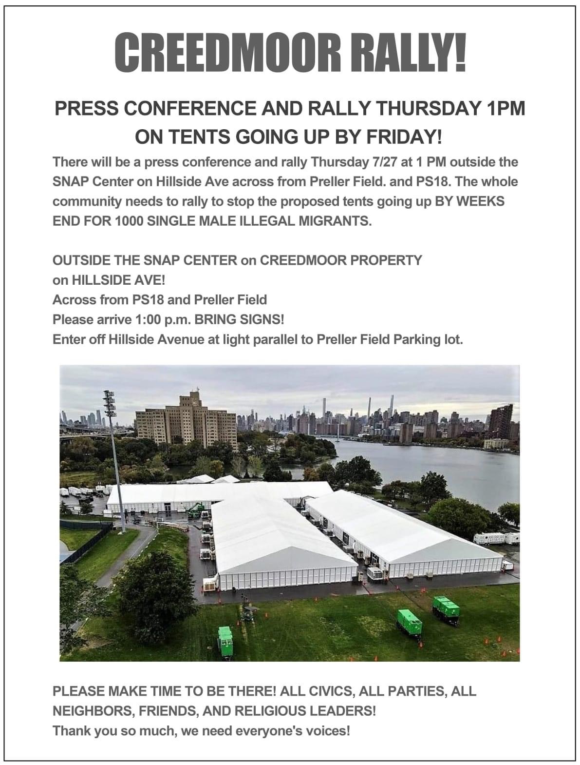 The city has decided to put a large scale tent facility on the Creedmoor grounds to house up to 1000 migrants. This is scheduled to occur towards the end of the week.