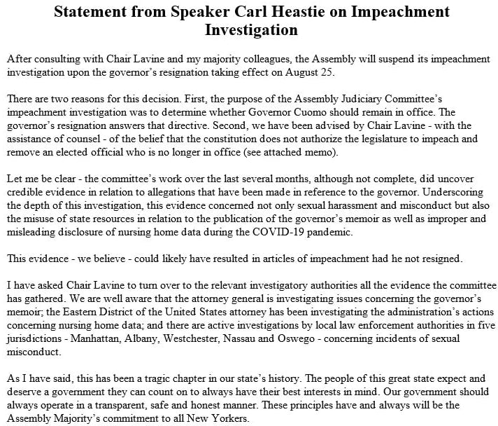 The impeachment investigation against Cuomo is over. Good boy Andrew will keep his pension, over $50K per year and the $5 million book fee. The NYS Assembly will not pursue any investigation matters against Cuomo. As for the fed, the nursing home investigation continues but lacks merit so far. What's next for Cuomo will be a wait and watch. The good news is he can run again and the NYC mayor is not pleased. From a legal analyst, In NYS, you cannot impeach and remove an elected official who is no longer in office. Majority leader Carl Heastie went ahead with the decision despite members on the NYS Assembly Judiciary Committee, which was leading the impeachment investigation were not consulted.