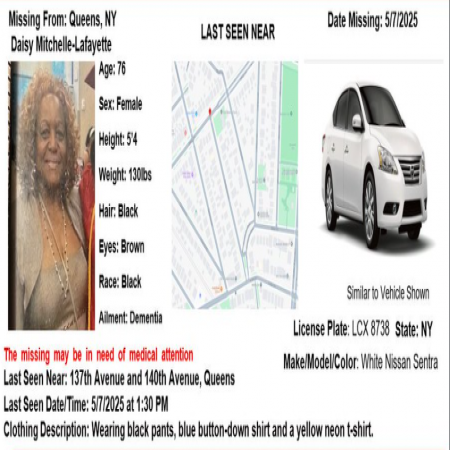 Daisy Mitchell-Lafayette, F/B/76 from the area of 226th Street and 147th Avenue in Queens. The missing has dementia and may be in need of medical attention.