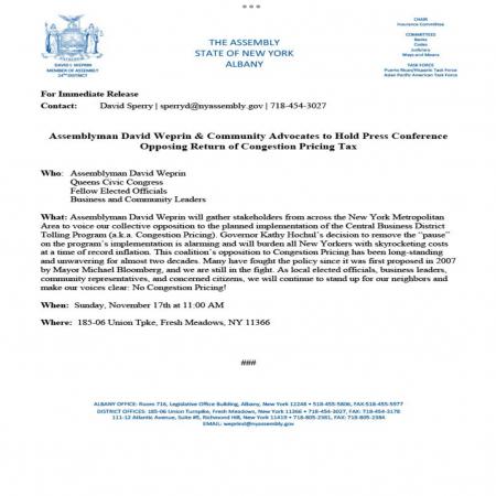 David Weprin hosting a press conference on Nov 17 opposing congestion pricing tax