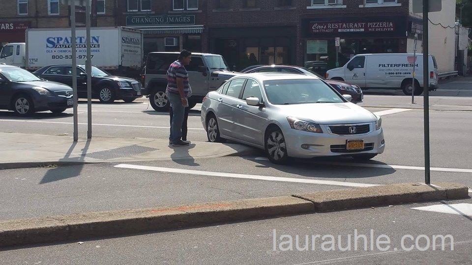 A driver made turn on Carnation Avenue from westbound Jericho Turnpike and went over the island. The vehicle is stuck on the sidewalk with a baby in the back seat. Several witnesses reported the driver was on the phone and called 911.