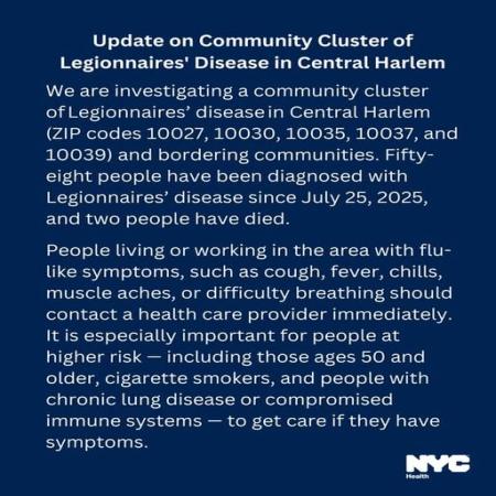 The Mayor's office confirmed two people died while over 60 were taken to hospitals for Legionnaire Disease reported in Central Harlem. The incidents occurred inside the cooling centers. It’s a treatable type of pneumonia, and not contagious or spread by window air conditioners.