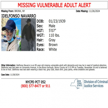 Delfonso Navarro, Male/White/85 years old from the Bronx, NY. The missing has dementia & may be in nDed of medical attention.