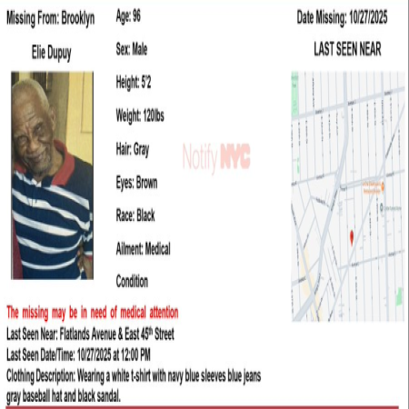Elie Dupuy, male/black/96 from the area of Flatlands Avenue and East 45th Street in Brooklyn. The missing may need medical attention.