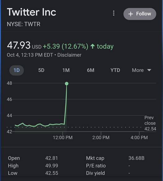 Elon is, in a letter to Twitter, proposing to close the Twitter deal after all at $54.20 per share in return for Twitter dropping its lawsuit against Musk. Shares halted after the announcing awaiting for the deal to confirm.