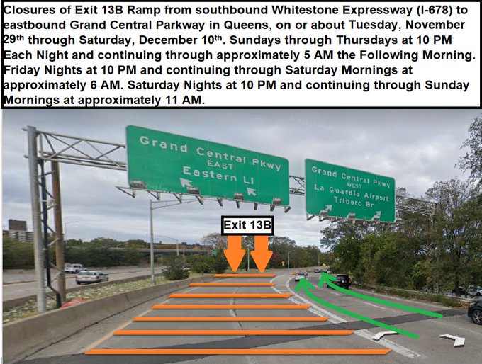 Starting November 29 to December 10, the Exit ramp 13B from the Whitestone Expressway southbound to Grand Central Parkway eastbound will be closed for construction during nightime.