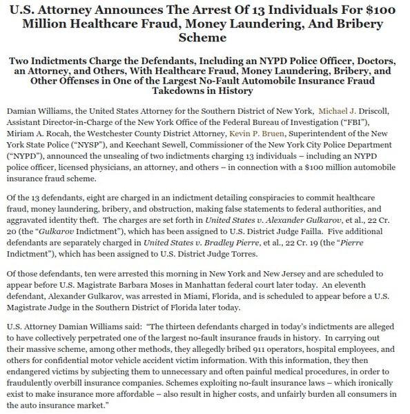 The US Attorney announced the arrest of 13 individuals for $100 million healthcare fraud, money laundering and bribery scheme. Two indictments charge the defendants including a cop, doctors, attorney and others with healthcare fraud, money laudenring, bribery and other in one of the largest no fault automobile insurance fraud takendown in history. Feds raided law office in Forest Hills, real estate office in Rego Park and doctor's office in Kew Gardens.