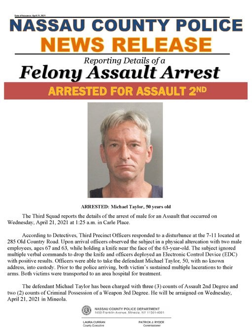The NCPD report the arrest of male for an assault that occurred on Wednesday, April 21, 2021 at 1:25 a.m. in Carle Place. According to NCPD, police responded to a disturbance at the 7-11 located at 285 Old Country Road. Upon arrival officers observed the subject in a physical altercation with two male employees, ages 67 and 63, while holding a knife near the face of the 63-year-old. The subject ignored multiple verbal commands to drop the knife and officers deployed an Electronic Control Device (EDC) with positive results. Officers were able to take the defendant Michael Taylor, 50, with no known address, into custody. Prior to the police arriving, both victim's sustained multiple lacerations to their arms. Both victims were transported to an area hospital for treatment. The defendant Michael Taylor has been charged with three (3) counts of Assault 2nd Degree and two (2) counts of Criminal Possession of a Weapon 3rd Degree. He will be arraigned on Wednesday, April 21, 2021 in Mineola.