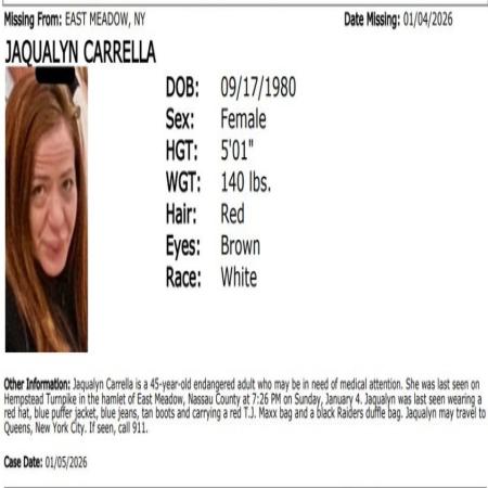 Jaqualyn Carrella  F/W/45 from East Meadow, NY.  Jaqualyn was last seen near Hempstead Turnpike. Jaqualyn may travel to Queens, NY. The missing may be in need of medical attention.