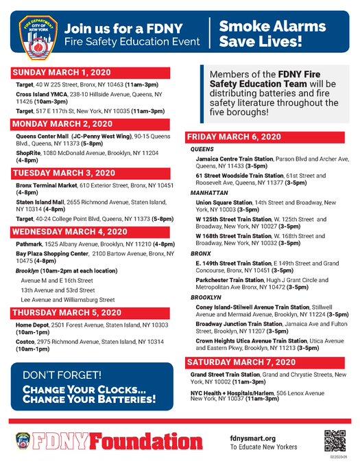 FDNY Fire Safety Education Unit at events in all five boroughs to learn how you can be safe. They will not be distributing smoke and/or carbon monoxide detectors but batteries and literature. They will have some samples of floor demo detectors not guaranteed to work to take. They are usually distributed by local politicians using taxpayers fund in time for election so have patience for free detectors which goes for $20 on Amazon.