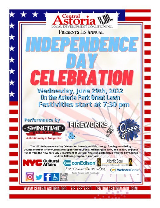Today at 7:30pm at the Astoria Park Green Lawn starts with music and other performances. This is the annual Independence celebration. Entrance is at Astoria Park S and 19th Street. The event is free and open to the public.