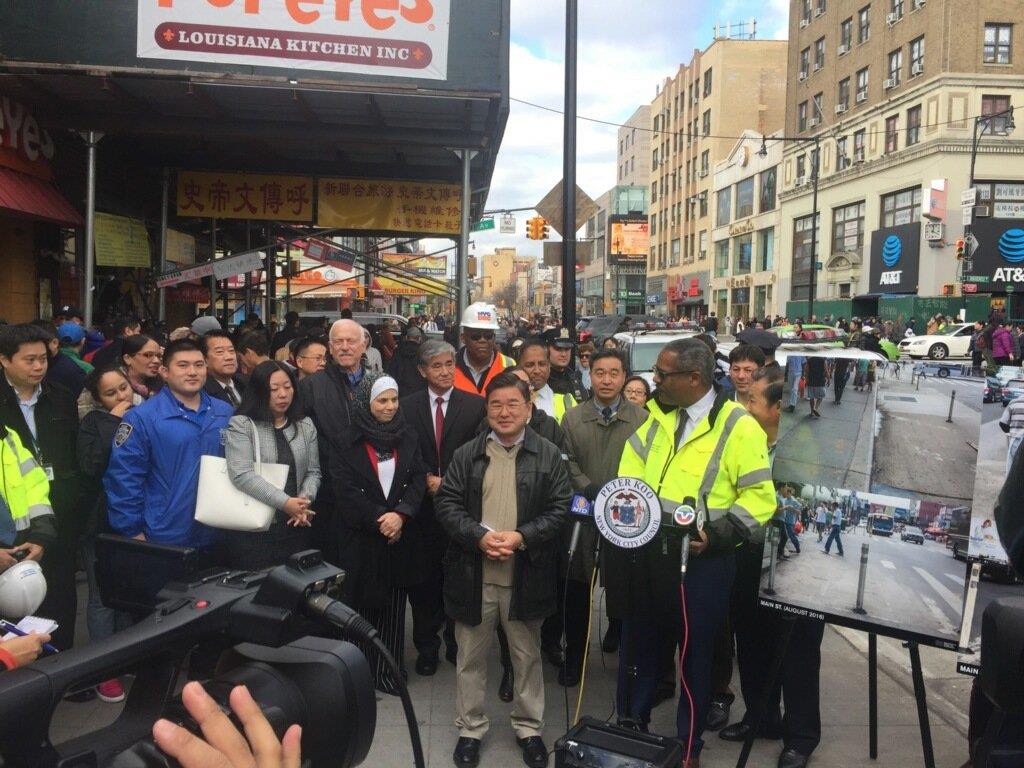 NYC Dept of Transportation confirmed on Friday, November 10, the sidewalk expansion in downtown Flushing is all complete. The project started in July 2016 and widened by 9 feet between 41st and 38th Avenues on Main Street. The project cost $7.8 million dollars. The city reported Main Street is the second most congested area for pedestrians after Times Square. pic courtesy of NYC Councilmember Peter Koo.