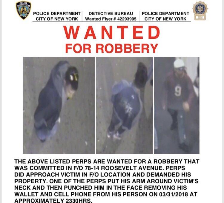 Police reported of four suspects wanted for robbing a victim on Roosevelt Avenue and Warren Street in Corona. It happened on March 31 around 11:30pm. Ongoing investigation.