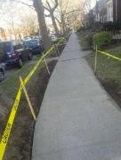 After damages caused by the maintenance driving the cart wheels on sidewalks during winter, Bellerose section started with soil patch before sprinkling with lawn seeds. \