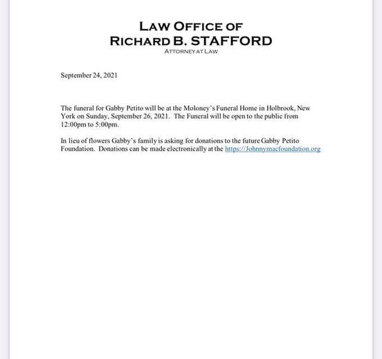 Funeral service for Gabby Petito is open to the public. It will be held on Septembr 26 from 12pm to 5pm at the Moloney Funeral Home in Holbrook. This is at 825 Main Street in Suffolk County. She will be creamated in Wyoming and her remains will be brought to Long Island.