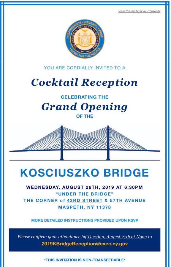 Wednesday, August 28 at 6:30pm in Maspeth, Governor Cuomo is inviting all for cocktail reception of the grand opening of Kosciuszko Bridge. The event will be held under the bridge at 47th Avenue and 53rd Avenue. Open to the public.