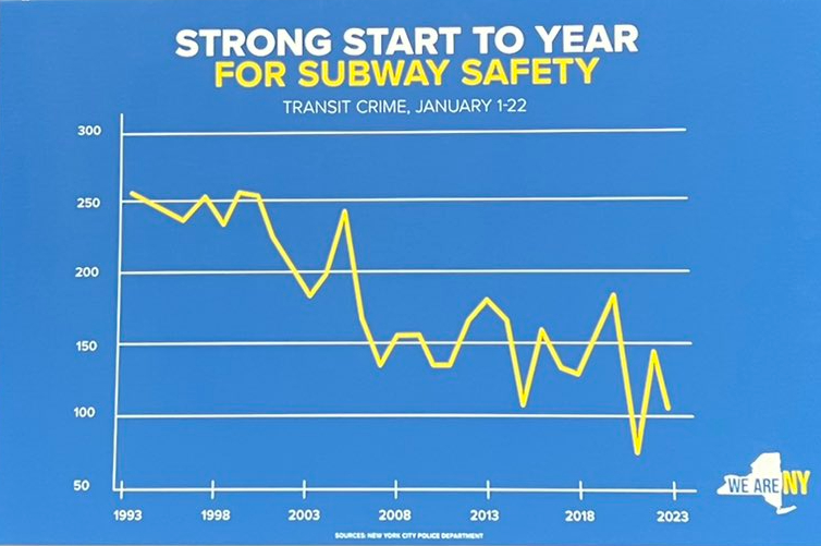 The Governor and Mayor held a press statement today in downtown Fulton Street station stating transit crime is down by 16% from October 2022 to January 2023. The MTA Chairman was also present. Absent was the NYPD Commissioner who still blames the Governor, Assembly and Senate Majority Leader for the spike in youth violence in the city despite no change to criminal justice reforms.