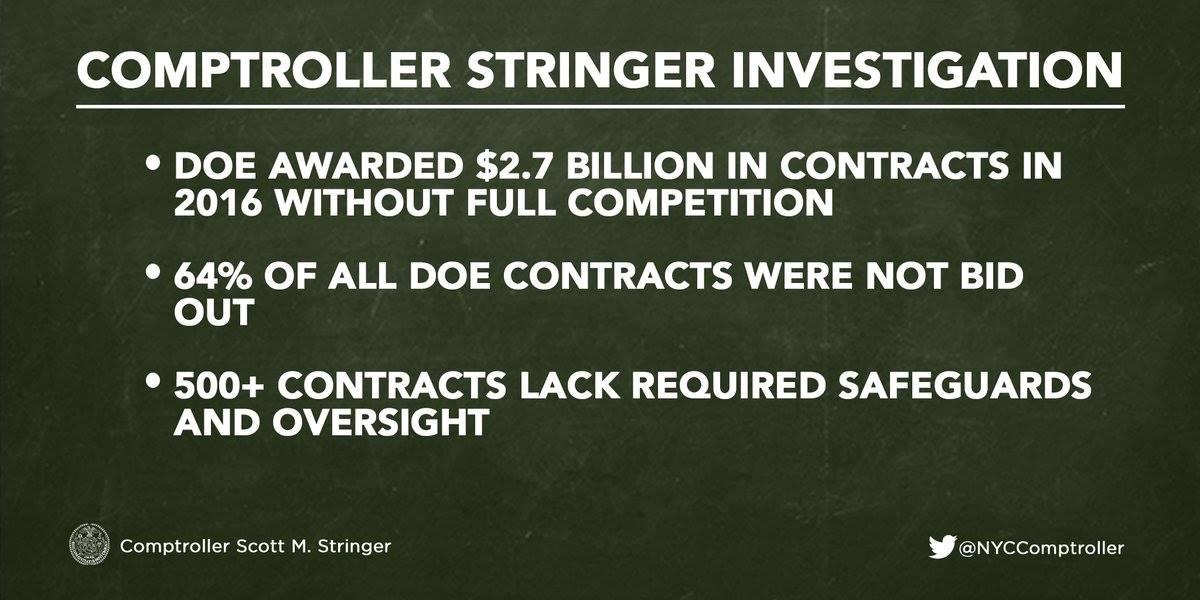 New York City Comptroller Scott M. Stringer is now investigating Dept of Education of two main issues. One is DOE gave out of $2.7 billion dollars contracts to 442 vendors without required safeguards and full bidding process. The other is DOE using funds over hundreds of millions of dollars without registering contracts by notification and continues by billing after the terms expired.