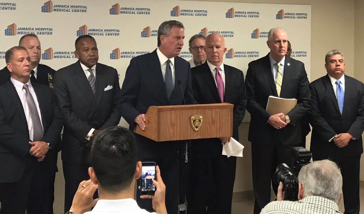 Mayor di Blasio and NYPD Commissioner are at Jamaica Hospital on Jamaica Avenue and Van Wyck Expressway service road. Police closed one lane to Atlantic Avenue. The mayor and commissioner will update the status. Update - The suspect is dead from self inflicted gun shot. The 30 year old male officer is in stable condition.