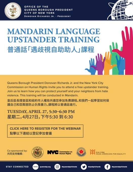 Tuesday, April 27 at 5:30pm, there will be an upstander training program and self defense to protect yourself against crimes instead of calling 911 or NYPD. This is in Mandarin language inviting civilians from hate violence and its via online. Remember if you have been assaulted or harassed, police response is longer and when they do show up they will start giving you pamphlets to take upstander training or self defense. Even if a criminal has a gun robbing you, fight back with chop chop ninja. The event is open to the public. More dates will be announced for upstanders and self defense classes to protect yourself instead of NYPD.