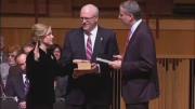 Melinda Katz was sworn in by Mayor di Blasio at Queens College with crowds watching her taking the oath as the Borough President yesterday. \