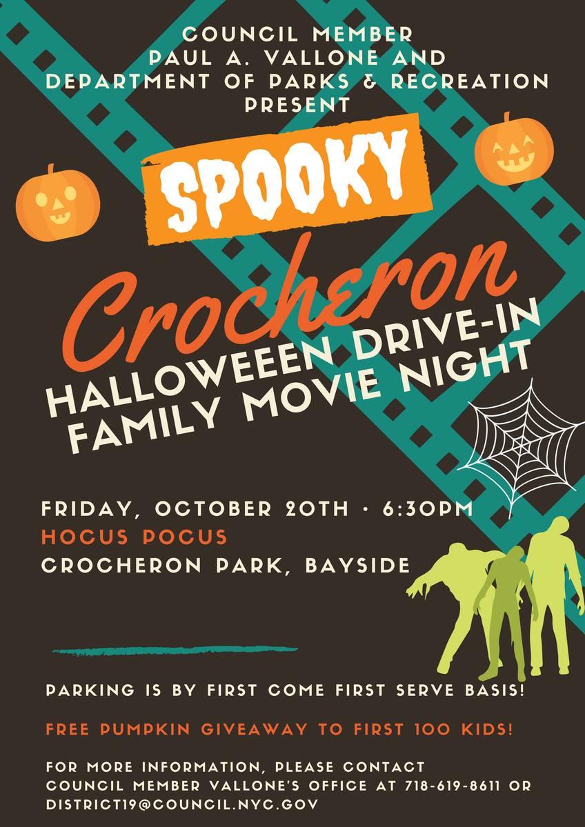 Friday, October 20 in Crocheron Park at 6:30pm. Open to the public. Plus FREE pumpkin giveaway to the first 100 kids.