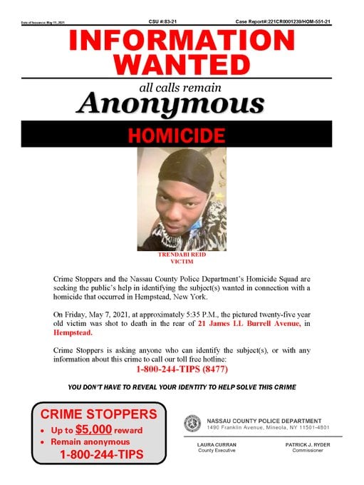 The Homicide Squad reports the details of a homicide that was discovered on Friday, May 7, 2021 at 5:40pm in Hempstead. According to detectives, a male was found deceased on James L Burrell Avenue with an apparent gunshot wound. The investigation is ongoing.