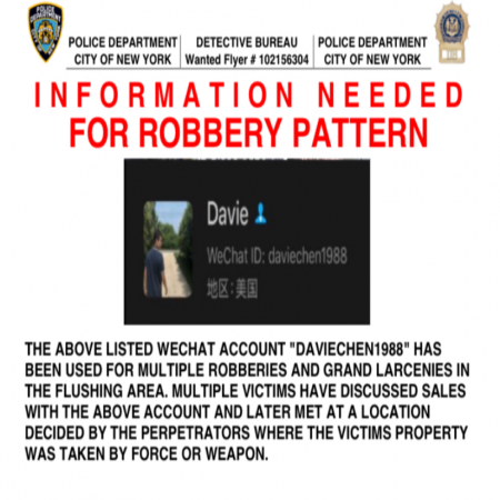 Please be aware of the following WeChat account “daviechen1988”. The perpetrators used this account to discuss sales with victims. After they met up, perps did multiple robberies and grand larcenies in the Flushing area.