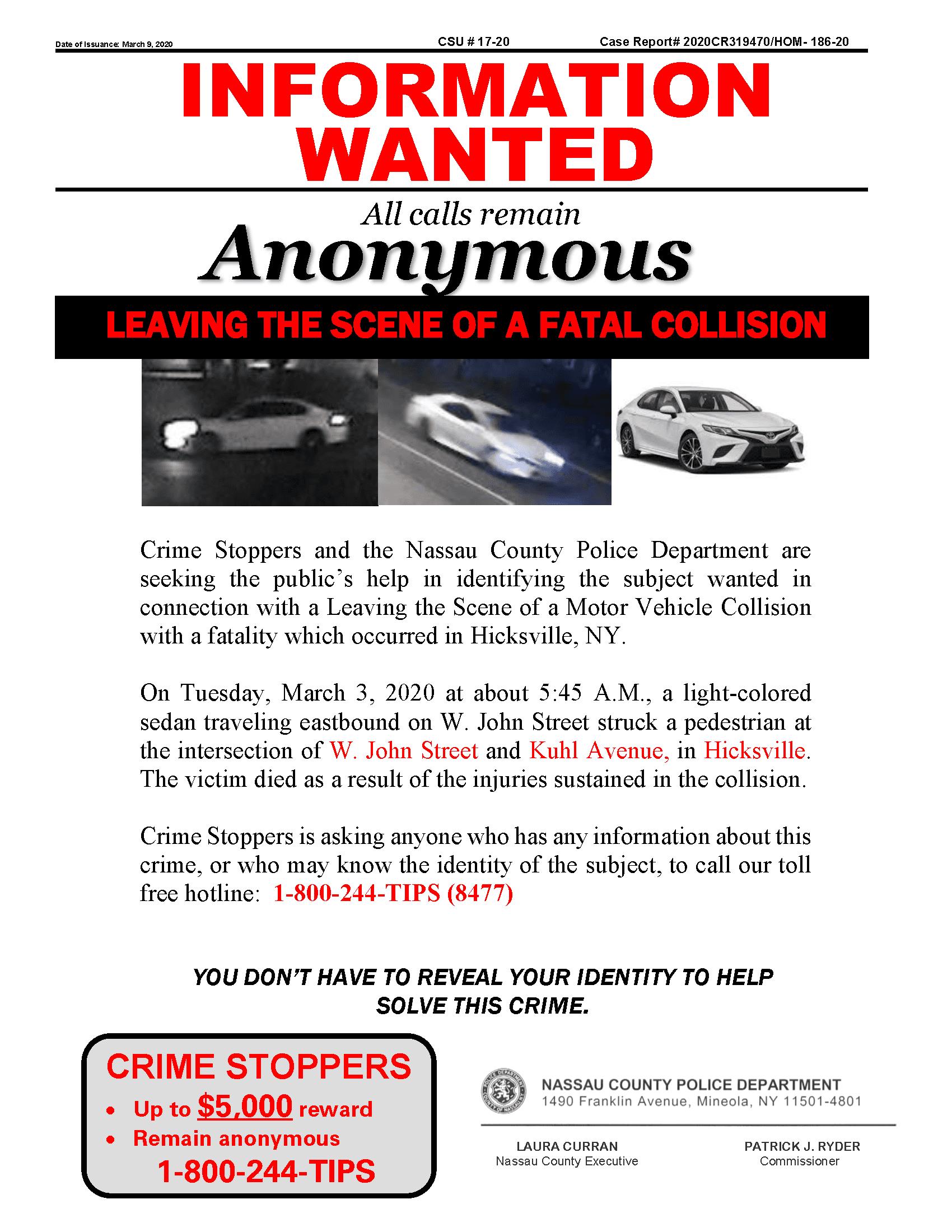 The Nassau County police released the vehicle picture wanted for the fatal incident in Hicksville. The hit and run suspect for the incident that occurred on March 3 around 5:45am has the suspect still at large.